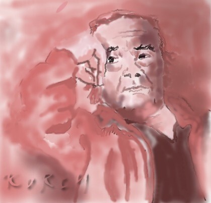 An old man is depicted with his hand of the forehead, anguished by memories and troubles. The red-orange atmosphere is rarefied, giving a mystic tone of gloom to the scene.