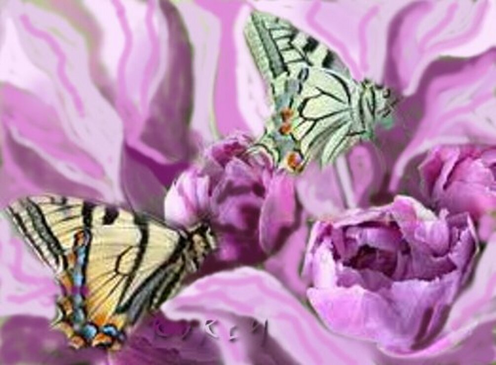 A couple of butterflies is flying over a group of roses, absorbing from them the nectar of life. Clear colours and a sense of lightness offer serenity to the observer.